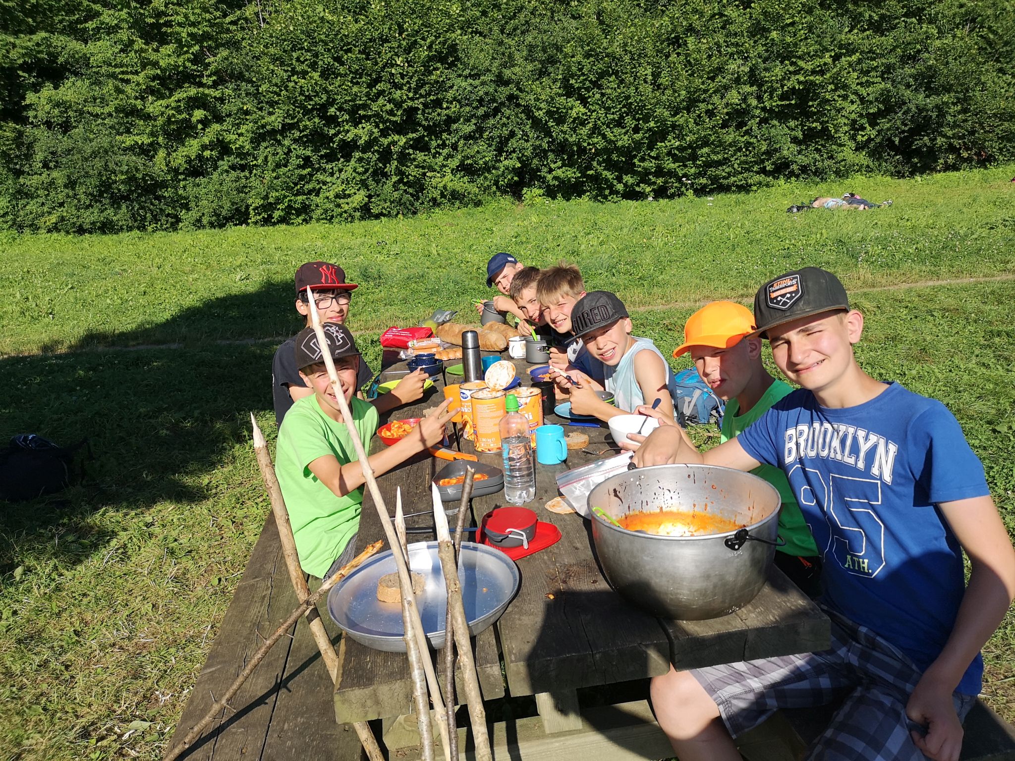 Das anhaltende schöne Wetter hat die ca. 20Km lange Wanderung zu einem Highlight in dieser Woche gemacht. Der Mittagsrast fand in einer grossen Burgruine statt. Die Küche hat uns dort empfangen und sehr fein verpflegt. Am Abend konnten sich die Gruppen auf dem Platz, am Feuer Speck oder Marshmallows bräteln.